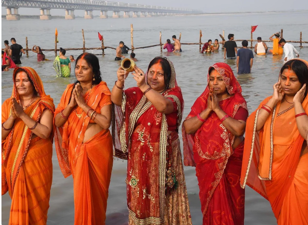 3. संध्या अर्घ्य (तीसरा दिन): अस्त होते सूर्य को नदी या तालाब के किनारे अर्घ्य दिया जाता है। महिलाएँ पीत वस्त्र धारण कर गीत गाती हैं—“केलवा के पात पर, उगले सूरज देव।”