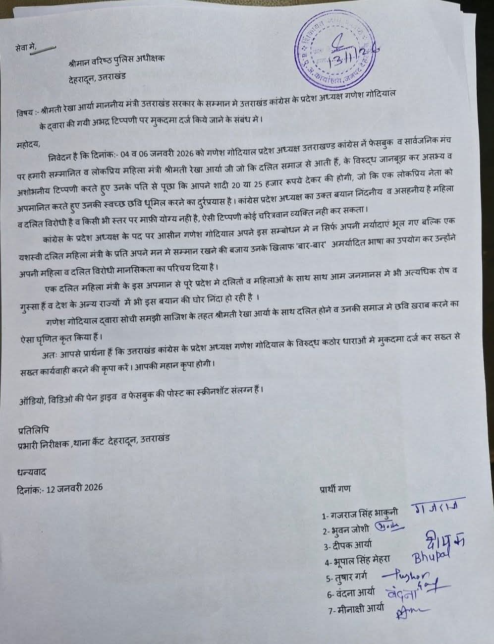 उत्तराखंड सरकार की कैबिनेट मंत्री श्रीमती रेखा आर्या के खिलाफ उत्तराखंड कांग्रेस के प्रदेश अध्यक्ष गणेश गोदियाल द्वारा की गई कथित अभद्र टिप्पणी को लेकर प्रदेश की राजनीति में तीखा विवाद खड़ा हो गया है। इस मामले को लेकर भारतीय जनता पार्टी के कार्यकर्ताओं ने कड़ा रुख अपनाते हुए वरिष्ठ पुलिस अधीक्षक (SSP) देहरादून को एक लिखित शिकायत सौंपकर गणेश गोदियाल के खिलाफ कठोर कानूनी धाराओं में मुकदमा दर्ज करने और सख्त कार्रवाई की मांग की है।